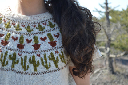 the Cacti Crop sweater from Boho Chic Fiber Co : Inspired by plants! magnificent cactus pattern on the yoke of this boxy and cropped sweater. It is knitted in the round, from top to bottom, so you can adapt the length you want.